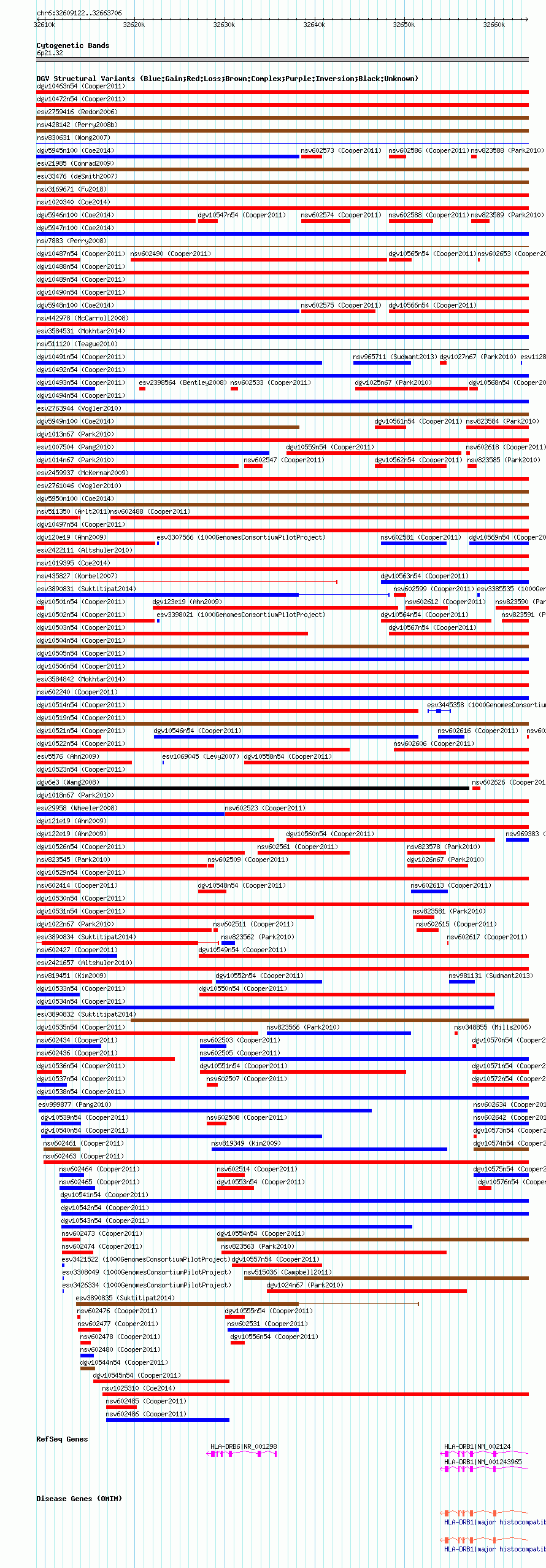 Variant DetailsVariant: nsv602441| Internal ID | 16389850 | | Landmark | | | Location Information | | | Cytoband | 6p21.32 | | Allele length | | Assembly | Allele length | | hg38 | 54585 | | hg19 | 54585 | | hg18 | 54585 |