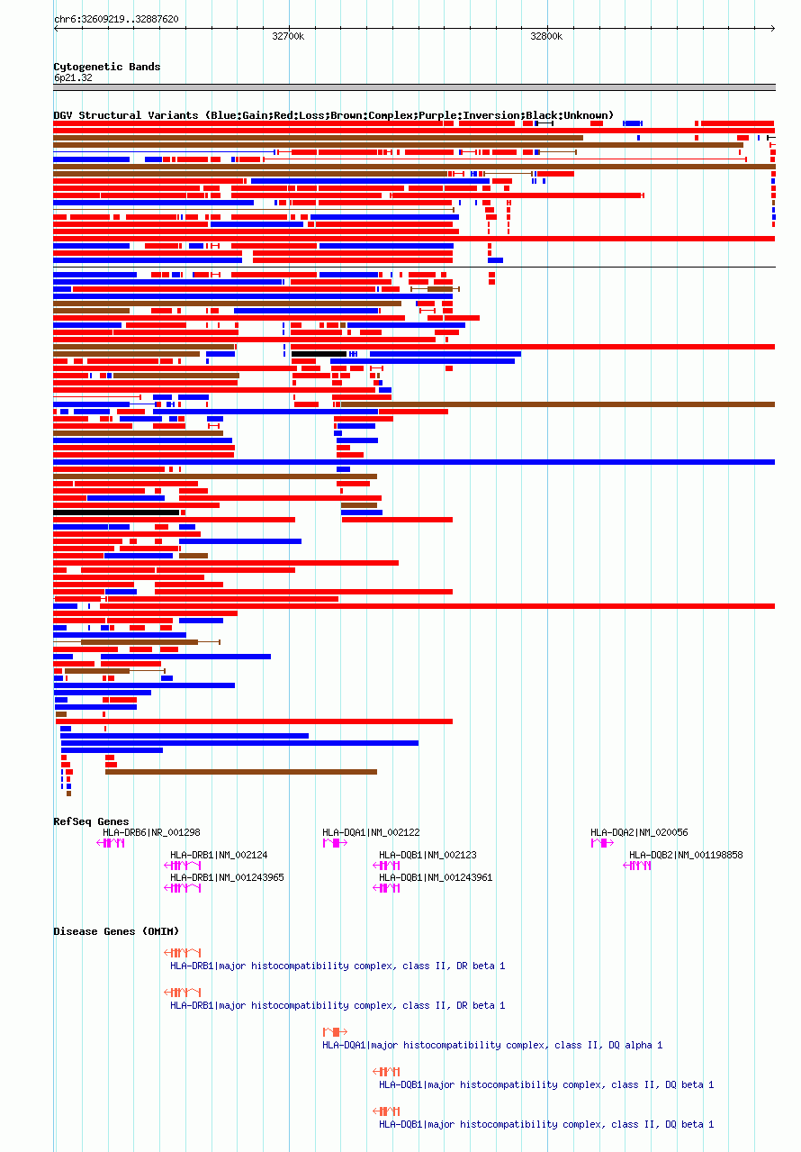 | | Variant Type | CNV loss | | Copy Number | | | Allele State | | | Allele Origin | | | Probe Count | | | Validation Flag | | | Merged Status | M | | Merged Variants | dgv10490n54 | | Supporting Variants | nssv1055609 | | Samples | | | Known Genes | HLA-DQA1, HLA-DQA2, HLA-DQB1, HLA-DQB2, HLA-DRB1, HLA-DRB6 | | Method | SNP array | | Analysis | Illumina SNP array copy number analysis | | Platform | Not reported | | Comments | | | Reference | Cooper_et_al_2011 | | Pubmed ID | 21841781 | | Accession Number(s) | nsv602447