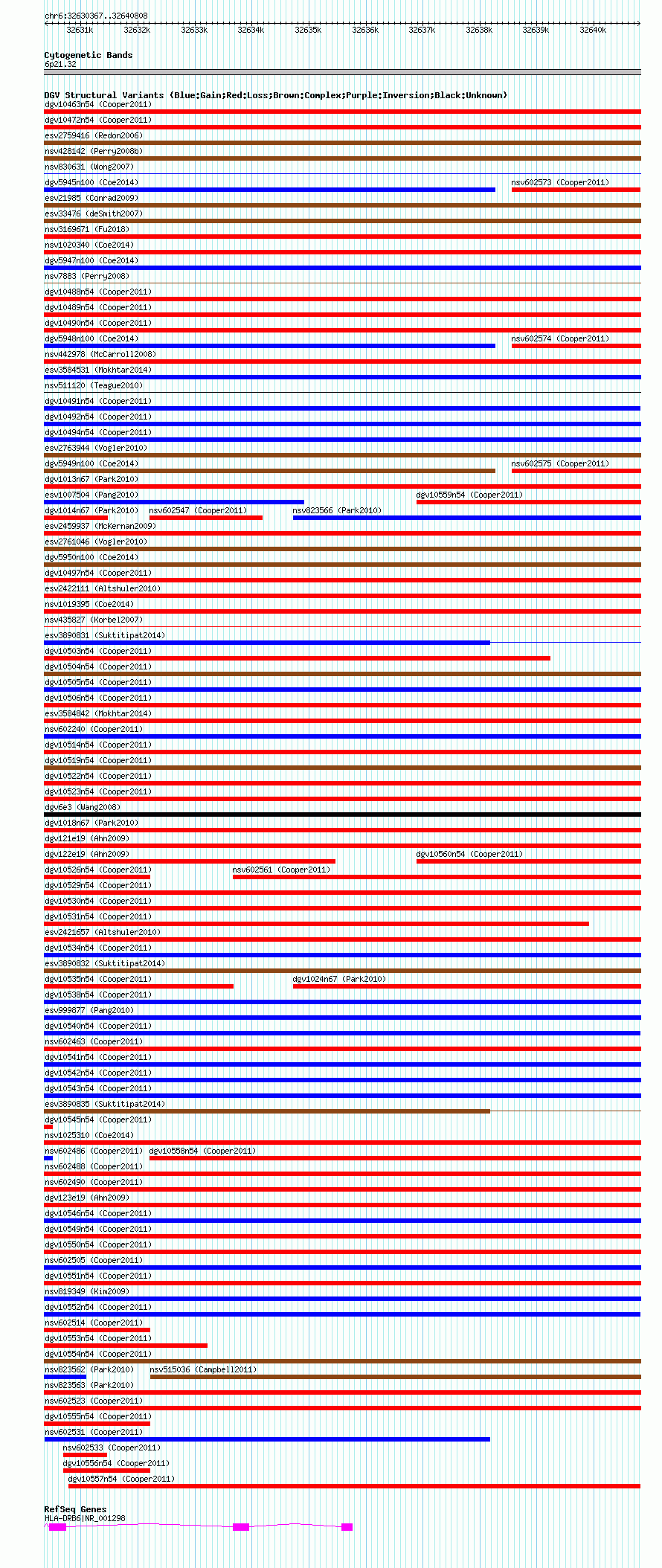Variant DetailsVariant: nsv602532| Internal ID | 16389941 | | Landmark | | | Location Information | | | Cytoband | 6p21.32 | | Allele length | | Assembly | Allele length | | hg38 | 10442 | | hg19 | 10442 | | hg18 | 10442 |