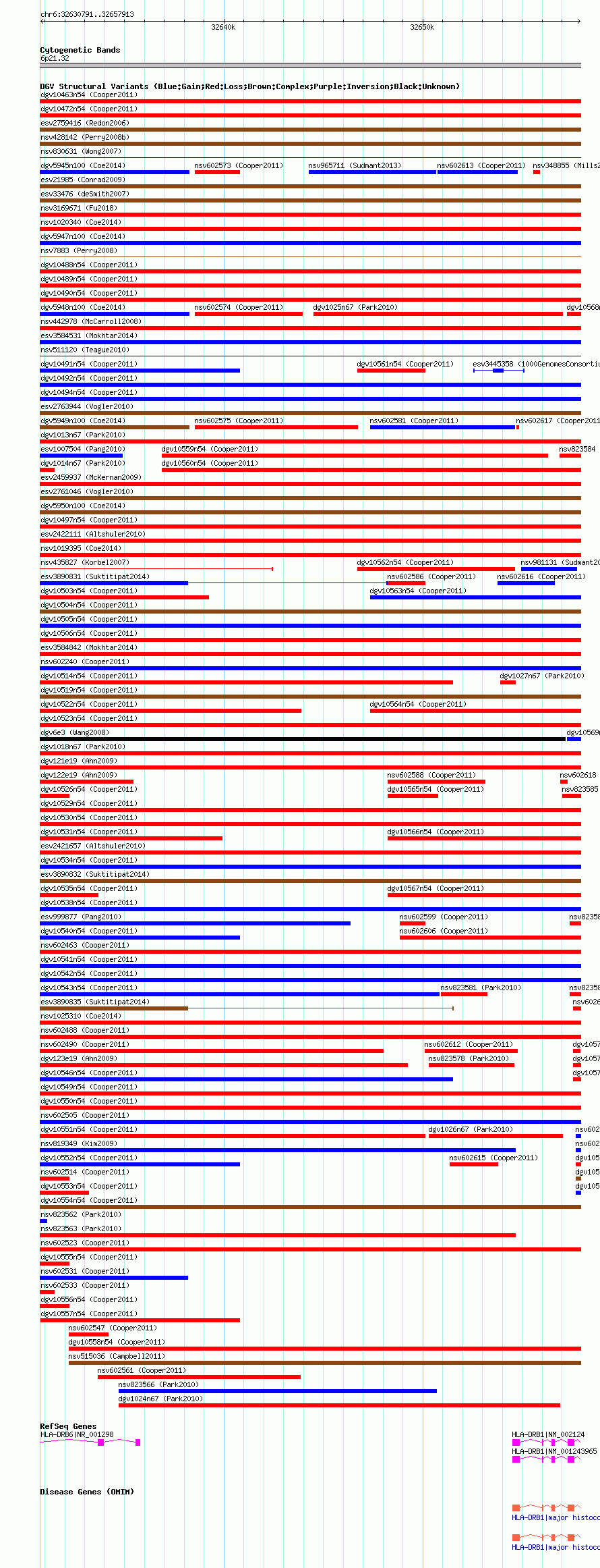 Variant DetailsVariant: nsv602544| Internal ID | 16389953 | | Landmark | | | Location Information | | | Cytoband | 6p21.32 | | Allele length | | Assembly | Allele length | | hg38 | 27123 | | hg19 | 27123 | | hg18 | 27123 |