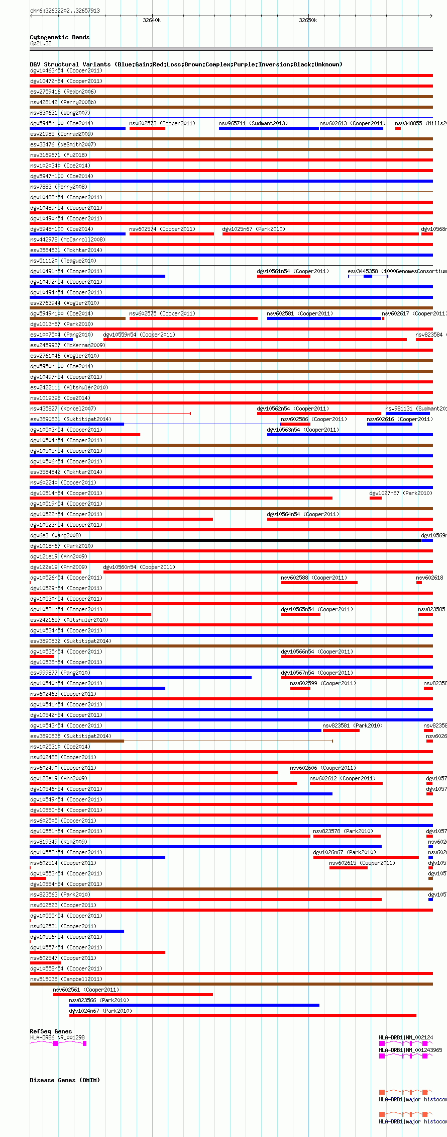 Variant DetailsVariant: nsv602552| Internal ID | 16389961 | | Landmark | | | Location Information | | | Cytoband | 6p21.32 | | Allele length | | Assembly | Allele length | | hg38 | 25712 | | hg19 | 25712 | | hg18 | 25712 |