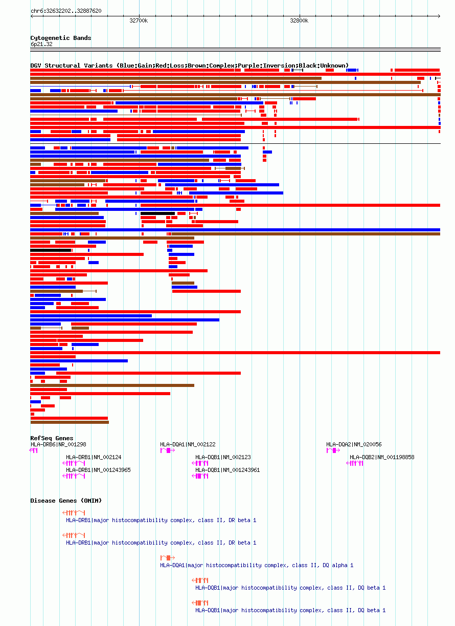 Variant DetailsVariant: nsv602560| Internal ID | 16389969 | | Landmark | | | Location Information | | | Cytoband | 6p21.32 | | Allele length | | Assembly | Allele length | | hg38 | 255419 | | hg19 | 255419 | | hg18 | 255419 |