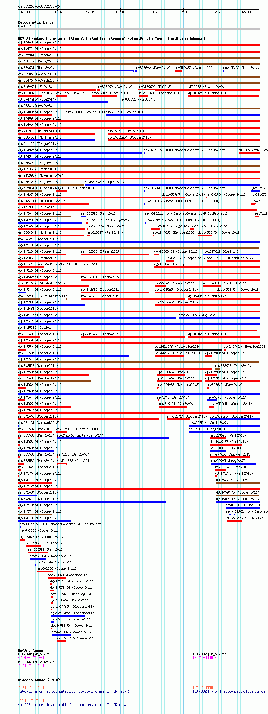 Variant DetailsVariant: nsv602630| Internal ID | 16390039 | | Landmark | | | Location Information | | | Cytoband | 6p21.32 | | Allele length | | Assembly | Allele length | | hg38 | 76304 | | hg19 | 76304 | | hg18 | 76304 |