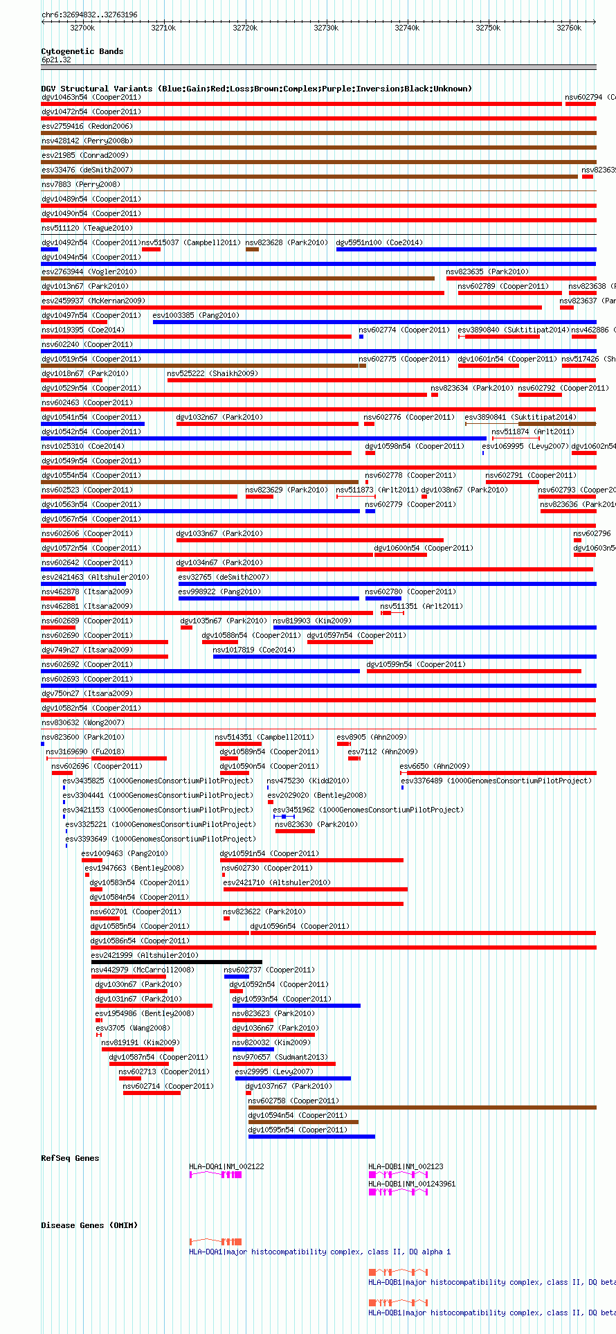 Variant DetailsVariant: nsv602695| Internal ID | 16390104 | | Landmark | | | Location Information | | | Cytoband | 6p21.32 | | Allele length | | Assembly | Allele length | | hg38 | 68365 | | hg19 | 68365 | | hg18 | 68365 |