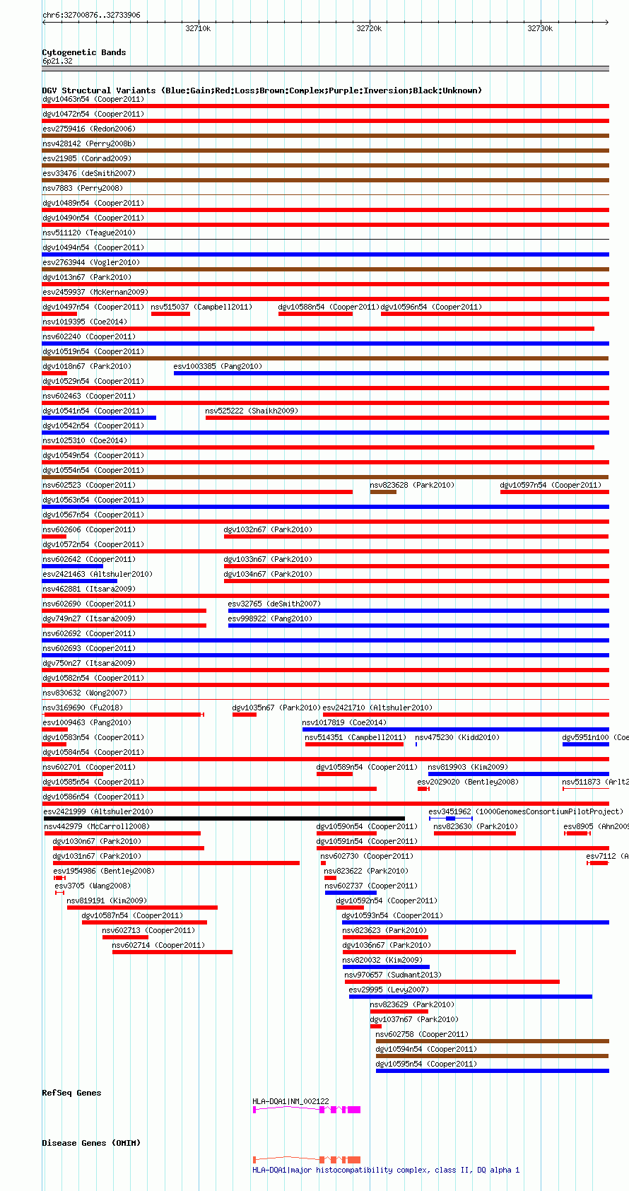 Variant DetailsVariant: nsv602705| Internal ID | 16390114 | | Landmark | | | Location Information | | | Cytoband | 6p21.32 | | Allele length | | Assembly | Allele length | | hg38 | 33031 | | hg19 | 33031 | | hg18 | 33031 |