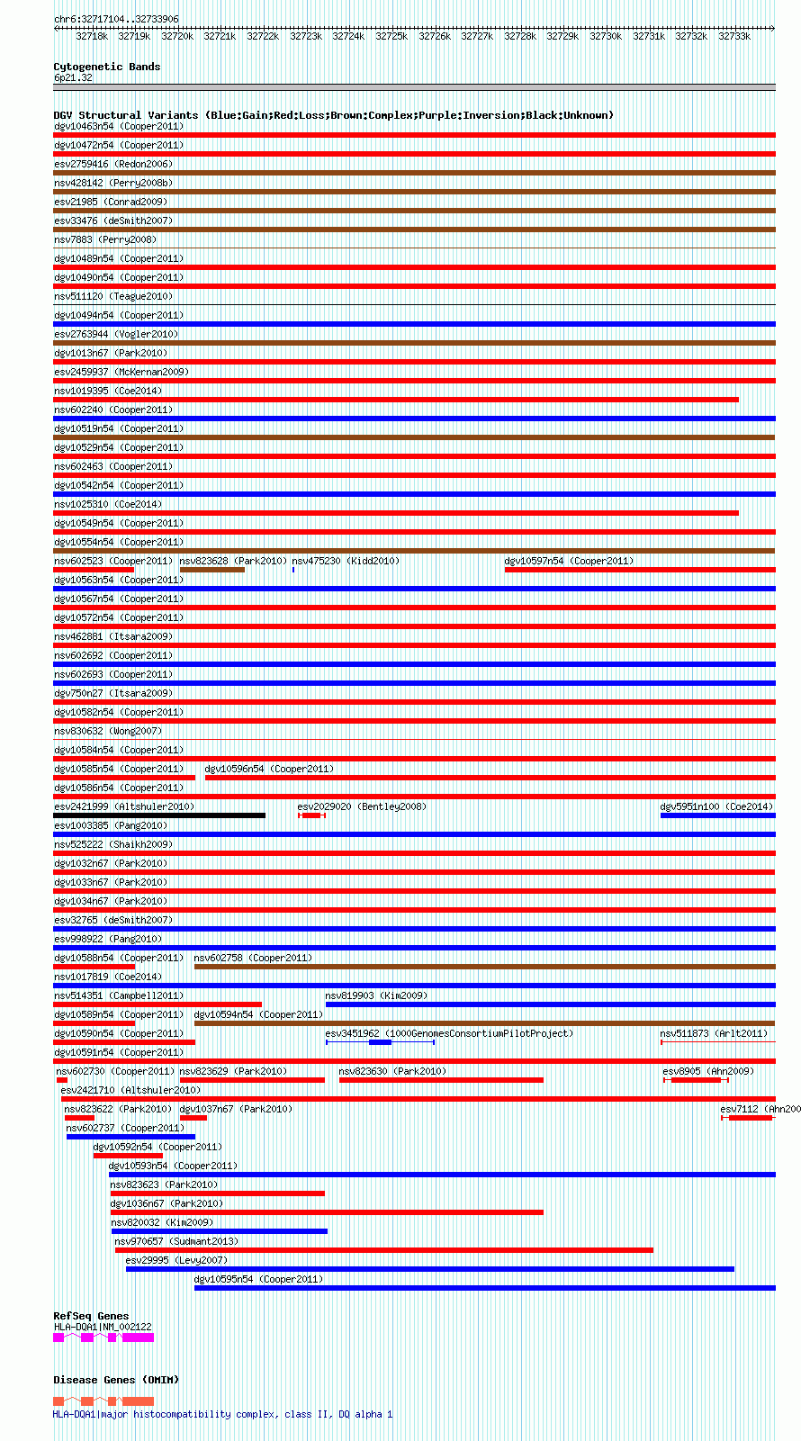 Variant DetailsVariant: nsv602726| Internal ID | 16390135 | | Landmark | | | Location Information | | | Cytoband | 6p21.32 | | Allele length | | Assembly | Allele length | | hg38 | 16803 | | hg19 | 16803 | | hg18 | 16803 |