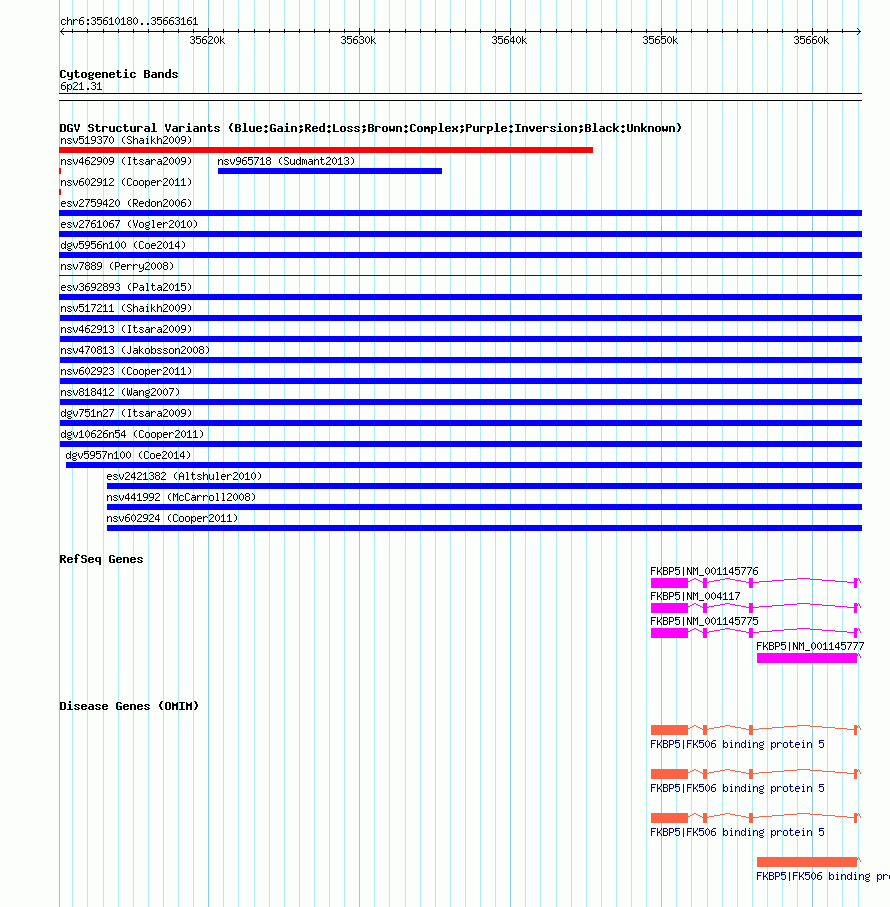 Variant DetailsVariant: nsv602921| Internal ID | 16390330 | | Landmark | | | Location Information | | | Cytoband | 6p21.31 | | Allele length | | Assembly | Allele length | | hg38 | 52982 | | hg19 | 52982 | | hg18 | 52982 |