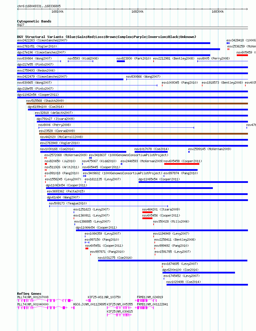 Variant DetailsVariant: nsv605367| Internal ID | 16392776 | | Landmark | | | Location Information | | | Cytoband | 6q27 | | Allele length | | Assembly | Allele length | | hg38 | 287475 | | hg19 | 287475 | | hg18 | 287475 |