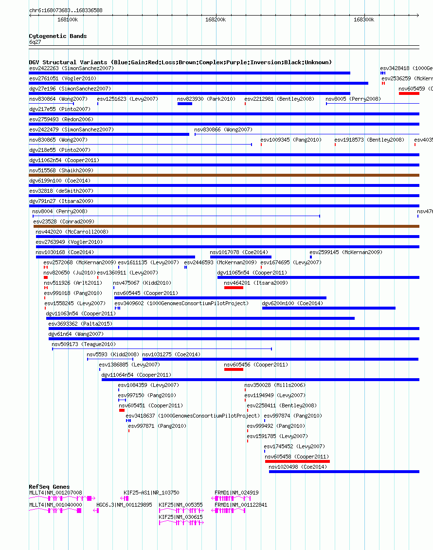 Variant DetailsVariant: nsv605369| Internal ID | 16392778 | | Landmark | | | Location Information | | | Cytoband | 6q27 | | Allele length | | Assembly | Allele length | | hg38 | 262906 | | hg19 | 262906 | | hg18 | 262906 |