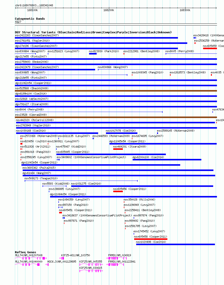 Variant DetailsVariant: nsv605376| Internal ID | 16392785 | | Landmark | | | Location Information | | | Cytoband | 6q27 | | Allele length | | Assembly | Allele length | | hg38 | 264246 | | hg19 | 264246 | | hg18 | 264246 |