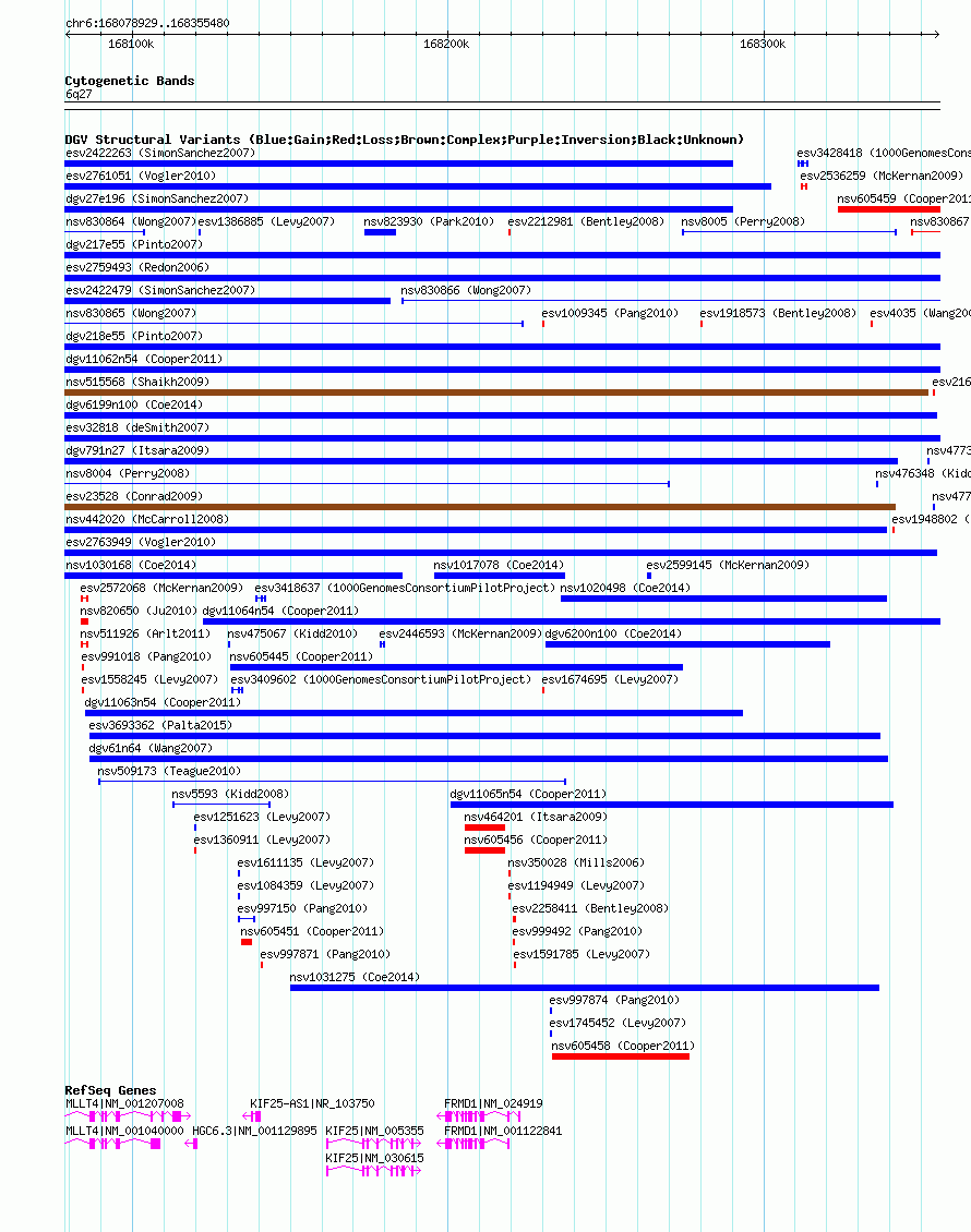 Variant DetailsVariant: nsv605390| Internal ID | 16392799 | | Landmark | | | Location Information | | | Cytoband | 6q27 | | Allele length | | Assembly | Allele length | | hg38 | 276552 | | hg19 | 276552 | | hg18 | 276552 |