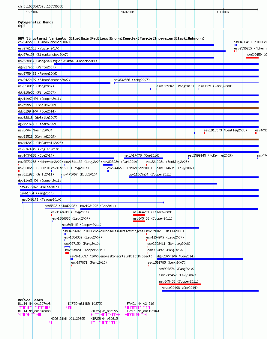 Variant DetailsVariant: nsv605392| Internal ID | 16392801 | | Landmark | | | Location Information | | | Cytoband | 6q27 | | Allele length | | Assembly | Allele length | | hg38 | 251830 | | hg19 | 251830 | | hg18 | 251830 |