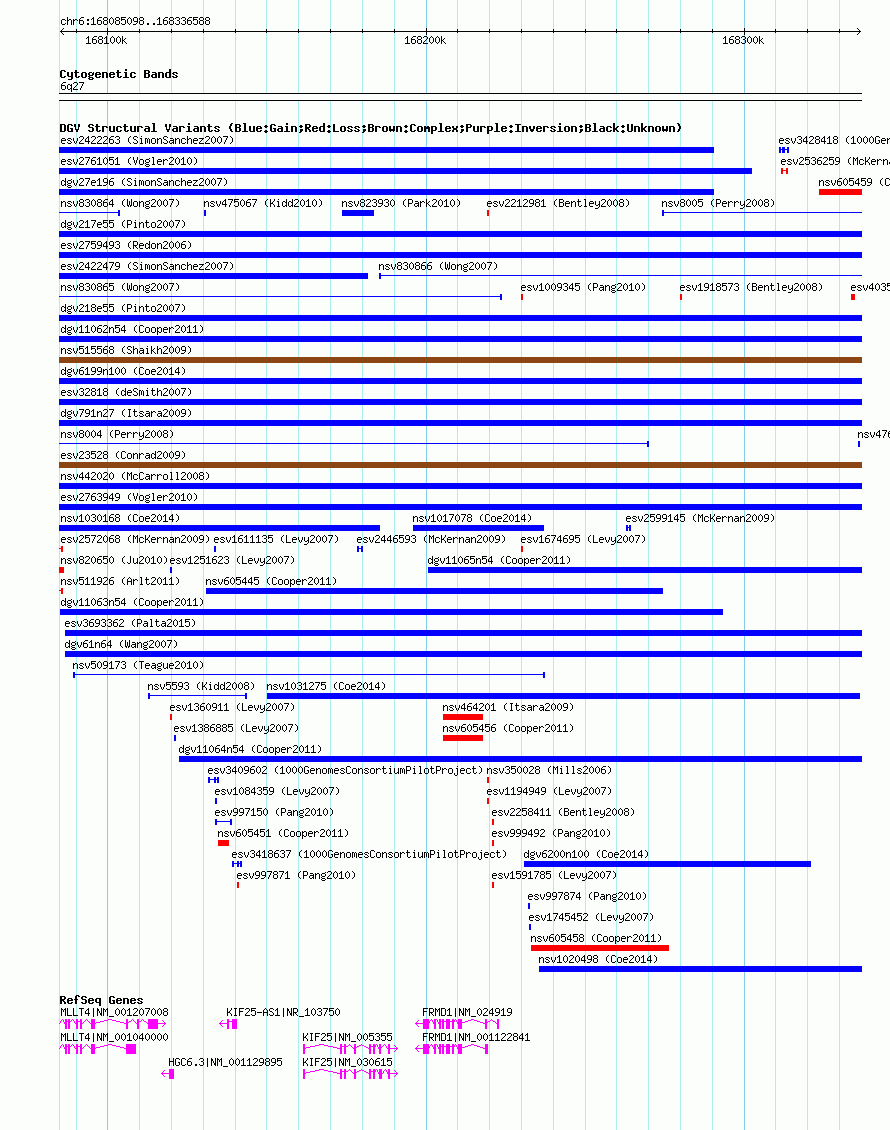 Variant DetailsVariant: nsv605394| Internal ID | 16392803 | | Landmark | | | Location Information | | | Cytoband | 6q27 | | Allele length | | Assembly | Allele length | | hg38 | 251491 | | hg19 | 251491 | | hg18 | 251491 |
