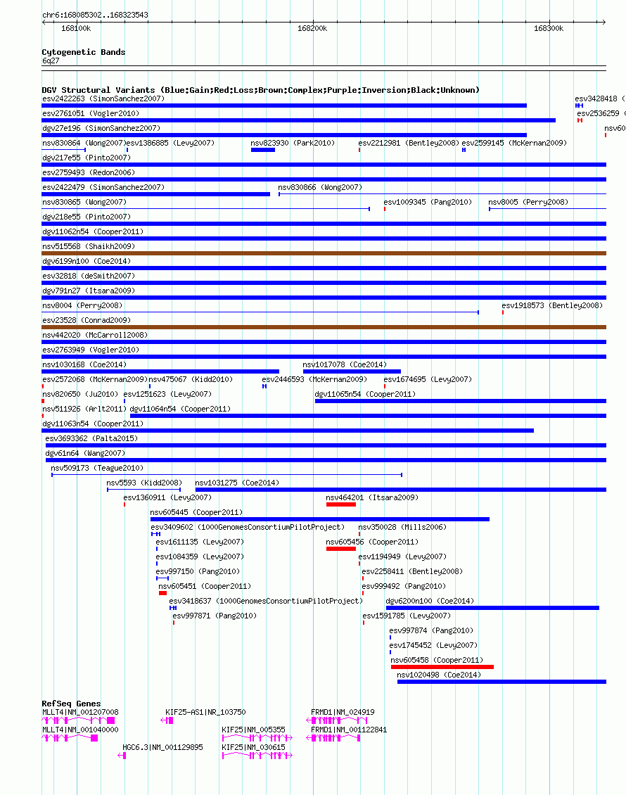 Variant DetailsVariant: nsv605395| Internal ID | 16392804 | | Landmark | | | Location Information | | | Cytoband | 6q27 | | Allele length | | Assembly | Allele length | | hg38 | 238242 | | hg19 | 238242 | | hg18 | 238242 |