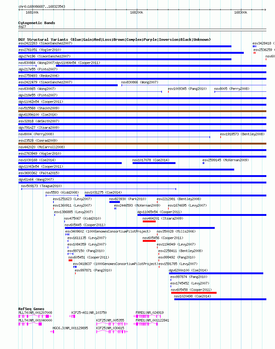Variant DetailsVariant: nsv605413| Internal ID | 16392822 | | Landmark | | | Location Information | | | Cytoband | 6q27 | | Allele length | | Assembly | Allele length | | hg38 | 236857 | | hg19 | 236857 | | hg18 | 236857 |