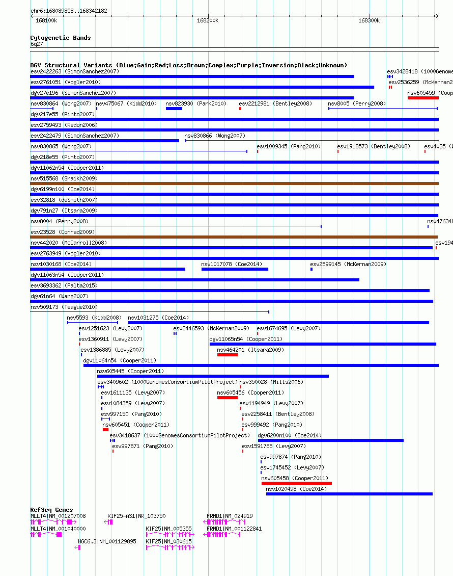 Variant DetailsVariant: nsv605426| Internal ID | 16392835 | | Landmark | | | Location Information | | | Cytoband | 6q27 | | Allele length | | Assembly | Allele length | | hg38 | 252325 | | hg19 | 252325 | | hg18 | 252325 |