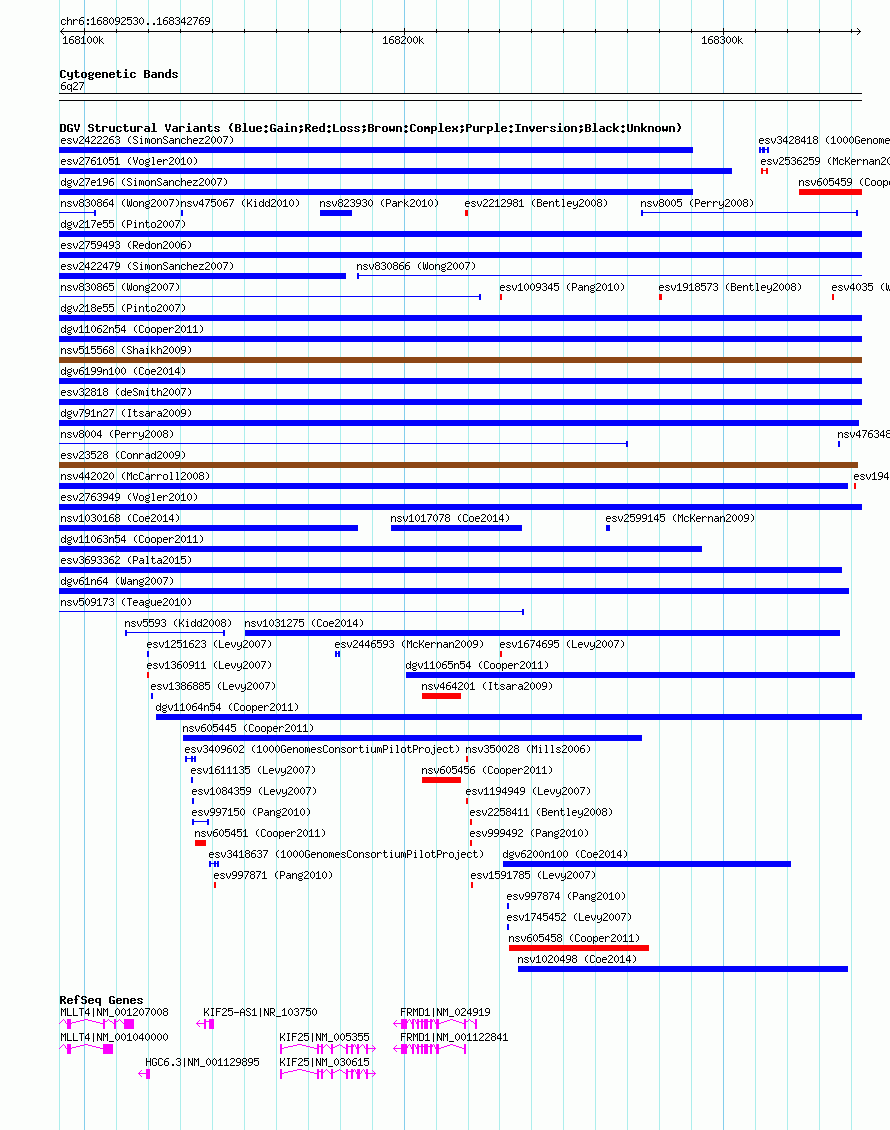 Variant DetailsVariant: nsv605440| Internal ID | 16392849 | | Landmark | | | Location Information | | | Cytoband | 6q27 | | Allele length | | Assembly | Allele length | | hg38 | 250240 | | hg19 | 250240 | | hg18 | 250240 |
