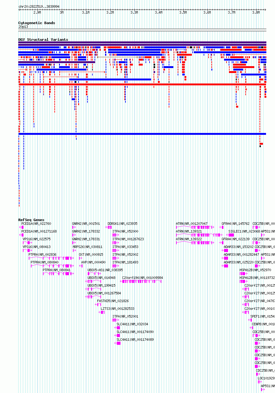 Variant DetailsVariant: nsv6056758| Internal ID | 21965992 | | Landmark | | | Location Information | | | Cytoband | 20p13 | | Allele length | | Assembly | Allele length | | hg38 | 1017476 | | hg19 | 1017477 |