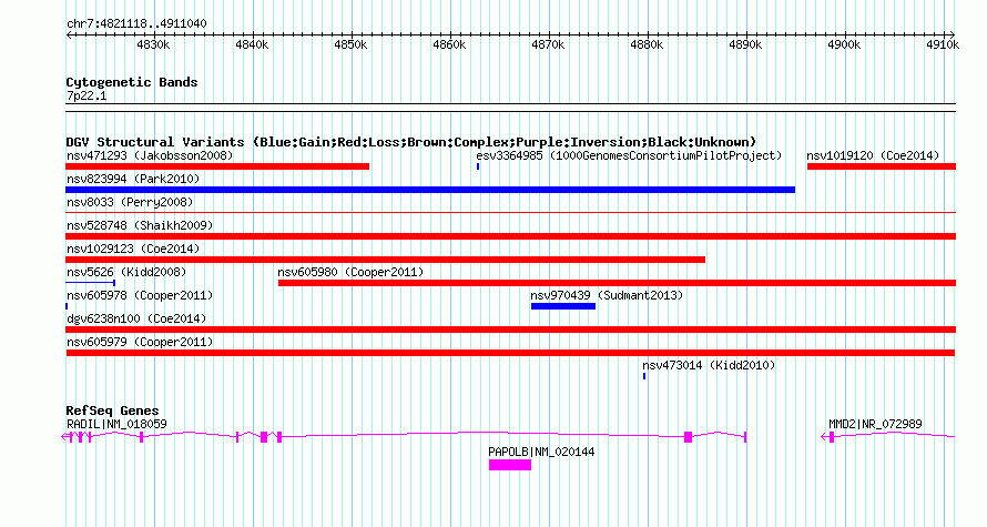 Variant DetailsVariant: nsv605979| Internal ID | 16393388 | | Landmark | | | Location Information | | | Cytoband | 7p22.1 | | Allele length | | Assembly | Allele length | | hg38 | 89923 | | hg19 | 89923 | | hg18 | 89923 |