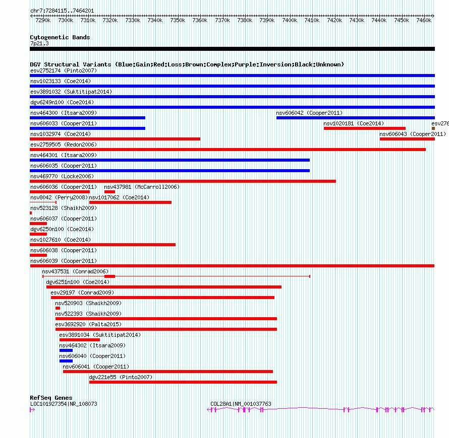 | | Variant Type | CNV loss | | Copy Number | | | Allele State | | | Allele Origin | | | Probe Count | | | Validation Flag | | | Merged Status | M | | Merged Variants | | | Supporting Variants | nssv1078878 | | Samples | | | Known Genes | COL28A1, LOC101927354 | | Method | SNP array | | Analysis | Illumina SNP array copy number analysis | | Platform | Not reported | | Comments | | | Reference | Cooper_et_al_2011 | | Pubmed ID | 21841781 | | Accession Number(s) | nsv606039
