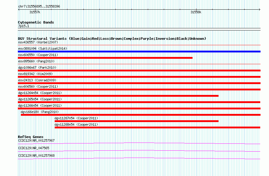 | | Variant Type | CNV loss | | Copy Number | | | Allele State | | | Allele Origin | | | Probe Count | | | Validation Flag | | | Merged Status | M | | Merged Variants | dgv11265n54 | | Supporting Variants | nssv1082487, nssv1082485, nssv1082486, nssv1082483, nssv1082488, nssv1082489, nssv1082482, nssv1082491, nssv1082490, nssv1082492, nssv1082484 | | Samples | | | Known Genes | CCDC129 | | Method | SNP array | | Analysis | Illumina SNP array copy number analysis | | Platform | Not reported | | Comments | | | Reference | Cooper_et_al_2011 | | Pubmed ID | 21841781 | | Accession Number(s) | nsv606562