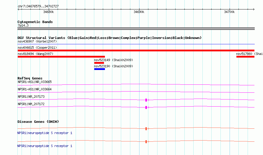 Variant DetailsVariant: nsv606615| Internal ID | 16047338 | | Landmark | | | Location Information | | | Cytoband | 7p14.3 | | Allele length | | Assembly | Allele length | | hg38 | 26149 | | hg19 | 26149 | | hg18 | 26149 |