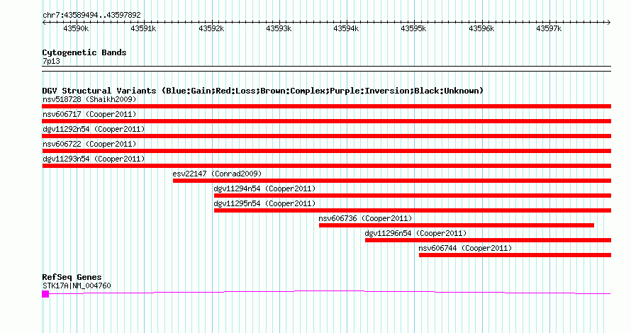| | Variant Type | CNV loss | | Copy Number | | | Allele State | | | Allele Origin | | | Probe Count | | | Validation Flag | | | Merged Status | M | | Merged Variants | dgv11292n54 | | Supporting Variants | nssv1083061, nssv1083060 | | Samples | | | Known Genes | STK17A | | Method | SNP array | | Analysis | Illumina SNP array copy number analysis | | Platform | Not reported | | Comments | | | Reference | Cooper_et_al_2011 | | Pubmed ID | 21841781 | | Accession Number(s) | nsv606720