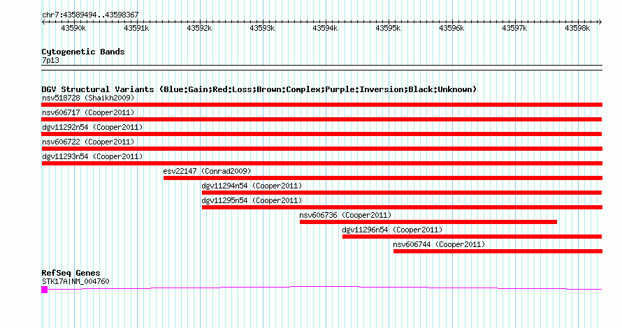 | | Variant Type | CNV loss | | Copy Number | | | Allele State | | | Allele Origin | | | Probe Count | | | Validation Flag | | | Merged Status | M | | Merged Variants | dgv11292n54 | | Supporting Variants | nssv1083072, nssv1083064, nssv1083063, nssv1083071, nssv1083065, nssv1083062, nssv1083068, nssv1083069, nssv1083070, nssv1083066, nssv1083067 | | Samples | | | Known Genes | STK17A | | Method | SNP array | | Analysis | Illumina SNP array copy number analysis | | Platform | Not reported | | Comments | | | Reference | Cooper_et_al_2011 | | Pubmed ID | 21841781 | | Accession Number(s) | nsv606721