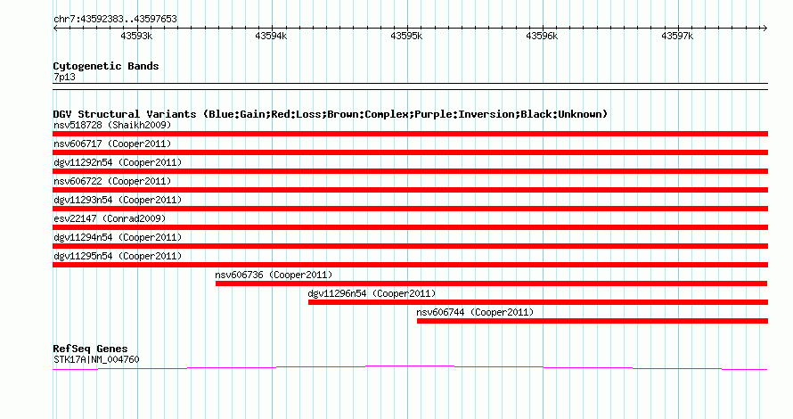 | | Variant Type | CNV loss | | Copy Number | | | Allele State | | | Allele Origin | | | Probe Count | | | Validation Flag | | | Merged Status | M | | Merged Variants | dgv11294n54 | | Supporting Variants | nssv1083185, nssv1083184 | | Samples | | | Known Genes | STK17A | | Method | SNP array | | Analysis | Illumina SNP array copy number analysis | | Platform | Not reported | | Comments | | | Reference | Cooper_et_al_2011 | | Pubmed ID | 21841781 | | Accession Number(s) | nsv606730