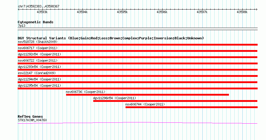 | | Variant Type | CNV loss | | Copy Number | | | Allele State | | | Allele Origin | | | Probe Count | | | Validation Flag | | | Merged Status | M | | Merged Variants | dgv11294n54 | | Supporting Variants | nssv1083187, nssv1083186 | | Samples | | | Known Genes | STK17A | | Method | SNP array | | Analysis | Illumina SNP array copy number analysis | | Platform | Not reported | | Comments | | | Reference | Cooper_et_al_2011 | | Pubmed ID | 21841781 | | Accession Number(s) | nsv606731