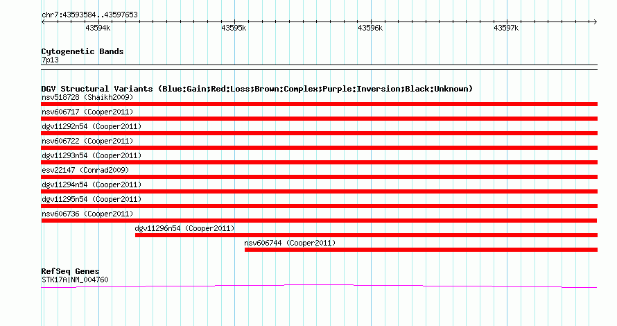 Variant DetailsVariant: nsv606736| Internal ID | 16394145 | | Landmark | | | Location Information | | | Cytoband | 7p13 | | Allele length | | Assembly | Allele length | | hg38 | 4070 | | hg19 | 4070 | | hg18 | 4070 |