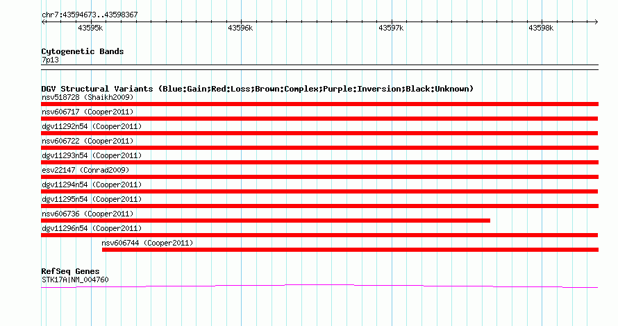 Variant DetailsVariant: nsv606742| Internal ID | 16394151 | | Landmark | | | Location Information | | | Cytoband | 7p13 | | Allele length | | Assembly | Allele length | | hg38 | 3695 | | hg19 | 3695 | | hg18 | 3695 |
