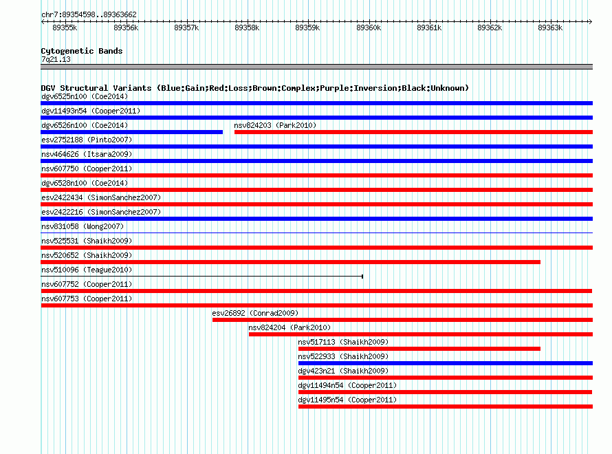 Variant DetailsVariant: nsv607752| Internal ID | 16395161 | | Landmark | | | Location Information | | | Cytoband | 7q21.13 | | Allele length | | Assembly | Allele length | | hg38 | 9065 | | hg19 | 9065 | | hg18 | 9065 |