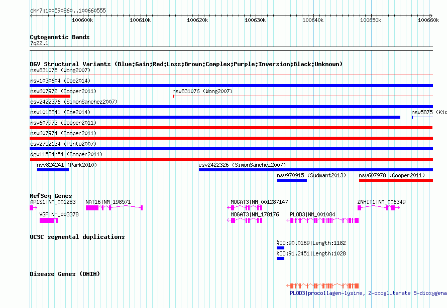 | Variant Type | CNV loss | Copy Number | | Allele State | | Allele Origin | | Probe Count | | Validation Flag | | Merged Status | M | Merged Variants | dgv11534n54 | Supporting Variants | nssv1091886 | Samples | | Known Genes | AP1S1, MOGAT3, NAT16, PLOD3, VGF, ZNHIT1 | Method | SNP array | Analysis | Illumina SNP array copy number analysis | Platform | Not reported | Comments | | Reference | Cooper_et_al_2011 | Pubmed ID | 21841781 | Accession Number(s) | nsv607975