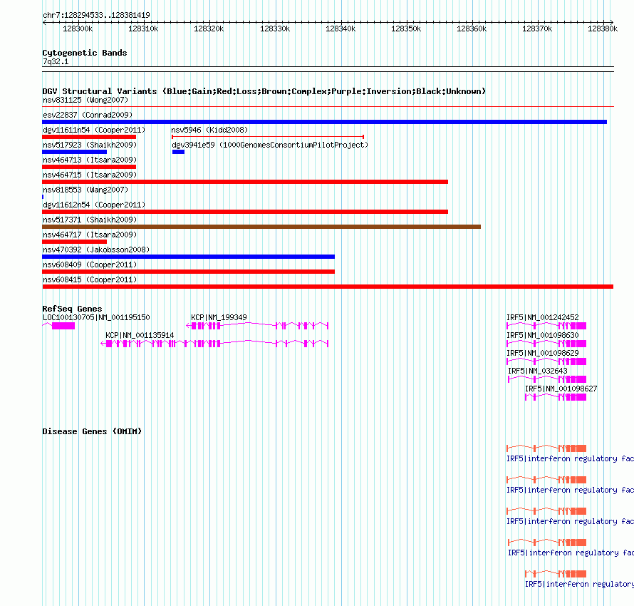 | | Variant Type | CNV loss | | Copy Number | | | Allele State | | | Allele Origin | | | Probe Count | | | Validation Flag | | | Merged Status | M | | Merged Variants | | | Supporting Variants | nssv1094515 | | Samples | | | Known Genes | IRF5, KCP, LOC100130705 | | Method | SNP array | | Analysis | Illumina SNP array copy number analysis | | Platform | Not reported | | Comments | | | Reference | Cooper_et_al_2011 | | Pubmed ID | 21841781 | | Accession Number(s) | nsv608415