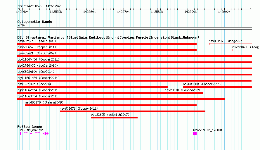 | | Variant Type | CNV loss | | Copy Number | | | Allele State | | | Allele Origin | | | Probe Count | | | Validation Flag | | | Merged Status | M | | Merged Variants | dgv11661n54 | | Supporting Variants | nssv1096514 | | Samples | | | Known Genes | PIP, TAS2R39 | | Method | SNP array | | Analysis | Illumina SNP array copy number analysis | | Platform | Not reported | | Comments | | | Reference | Cooper_et_al_2011 | | Pubmed ID | 21841781 | | Accession Number(s) | nsv608668