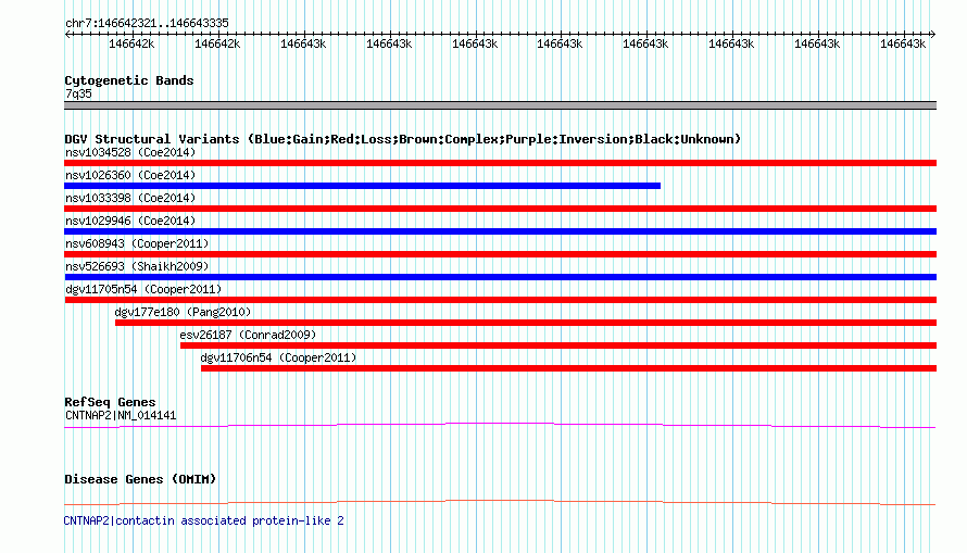| | Variant Type | CNV loss | | Copy Number | | | Allele State | | | Allele Origin | | | Probe Count | | | Validation Flag | | | Merged Status | M | | Merged Variants | dgv11705n54 | | Supporting Variants | nssv1097954, nssv1097953 | | Samples | | | Known Genes | CNTNAP2, MIR548I4 | | Method | SNP array | | Analysis | Illumina SNP array copy number analysis | | Platform | Not reported | | Comments | | | Reference | Cooper_et_al_2011 | | Pubmed ID | 21841781 | | Accession Number(s) | nsv608944