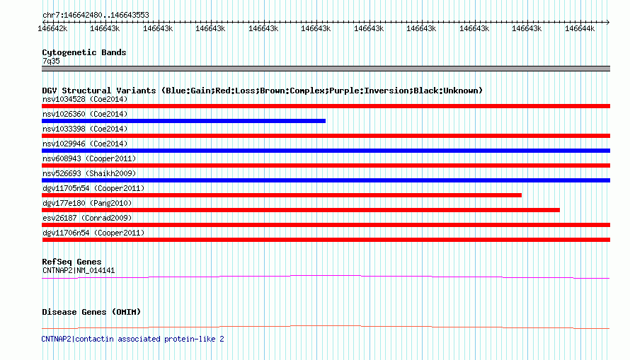 | | Variant Type | CNV loss | | Copy Number | | | Allele State | | | Allele Origin | | | Probe Count | | | Validation Flag | | | Merged Status | M | | Merged Variants | dgv11706n54 | | Supporting Variants | nssv1098058, nssv1098054, nssv1098055, nssv1098057, nssv1098056, nssv1098059 | | Samples | | | Known Genes | CNTNAP2, MIR548I4 | | Method | SNP array | | Analysis | Illumina SNP array copy number analysis | | Platform | Not reported | | Comments | | | Reference | Cooper_et_al_2011 | | Pubmed ID | 21841781 | | Accession Number(s) | nsv608948