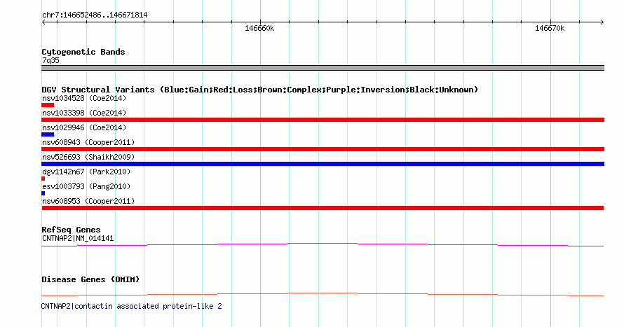 | | Variant Type | CNV loss | | Copy Number | | | Allele State | | | Allele Origin | | | Probe Count | | | Validation Flag | | | Merged Status | M | | Merged Variants | | | Supporting Variants | nssv1098071 | | Samples | | | Known Genes | CNTNAP2, MIR548I4 | | Method | SNP array | | Analysis | Illumina SNP array copy number analysis | | Platform | Not reported | | Comments | | | Reference | Cooper_et_al_2011 | | Pubmed ID | 21841781 | | Accession Number(s) | nsv608953