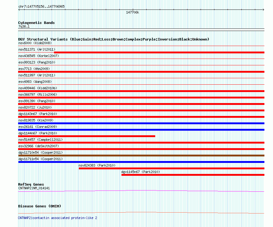 | | Variant Type | CNV gain | | Copy Number | | | Allele State | | | Allele Origin | | | Probe Count | | | Validation Flag | | | Merged Status | M | | Merged Variants | dgv11711n54 | | Supporting Variants | nssv1098100, nssv1098099 | | Samples | | | Known Genes | CNTNAP2 | | Method | SNP array | | Analysis | Illumina SNP array copy number analysis | | Platform | Not reported | | Comments | | | Reference | Cooper_et_al_2011 | | Pubmed ID | 21841781 | | Accession Number(s) | nsv608967