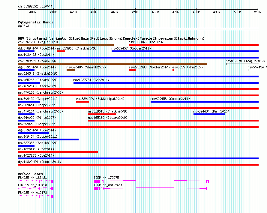 Variant DetailsVariant: nsv609455| Internal ID | 16396864 | | Landmark | | | Location Information | | | Cytoband | 8p23.3 | | Allele length | | Assembly | Allele length | | hg38 | 117353 | | hg19 | 117353 | | hg18 | 117353 |