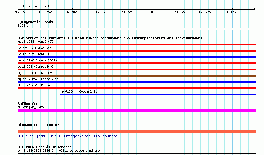 Variant DetailsVariant: nsv610201| Internal ID | 16397610 | | Landmark | | | Location Information | | | Cytoband | 8p23.1 | | Allele length | | Assembly | Allele length | | hg38 | 891 | | hg19 | 891 | | hg18 | 891 |