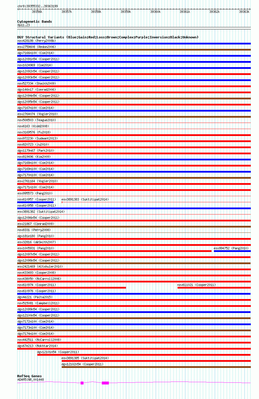 Variant DetailsVariant: nsv610988| Internal ID | 16398397 | | Landmark | | | Location Information | | | Cytoband | 8p11.22 | | Allele length | | Assembly | Allele length | | hg38 | 7868 | | hg19 | 7868 | | hg18 | 7868 |