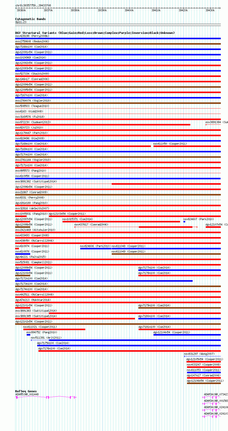 Variant DetailsVariant: nsv611019| Internal ID | 16398428 | | Landmark | | | Location Information | | | Cytoband | 8p11.22 | | Allele length | | Assembly | Allele length | | hg38 | 75950 | | hg19 | 75950 | | hg18 | 75950 |