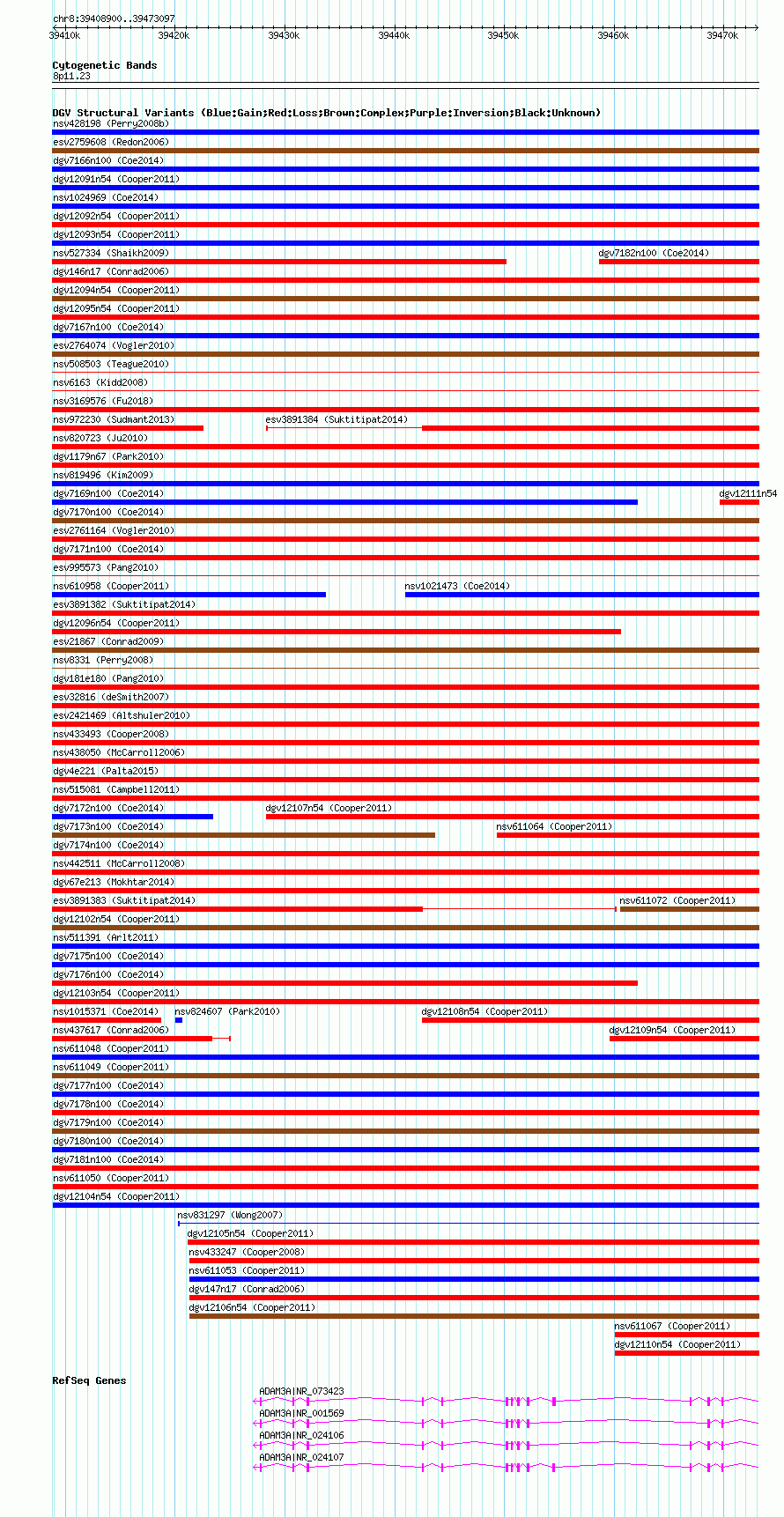 Variant DetailsVariant: nsv611050| Internal ID | 16398459 | | Landmark | | | Location Information | | | Cytoband | 8p11.22 | | Allele length | | Assembly | Allele length | | hg38 | 64198 | | hg19 | 64198 | | hg18 | 64198 |