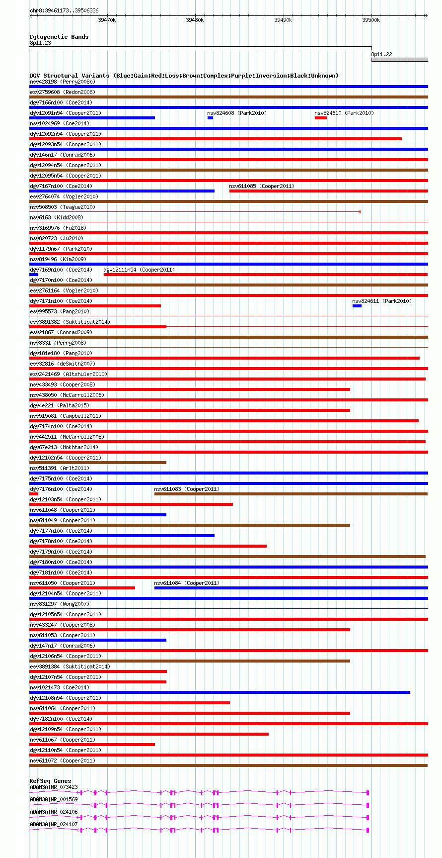 Variant DetailsVariant: nsv611074| Internal ID | 16398483 | | Landmark | | | Location Information | | | Cytoband | 8p11.22 | | Allele length | | Assembly | Allele length | | hg38 | 45164 | | hg19 | 45164 | | hg18 | 45164 |