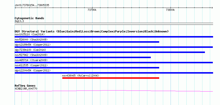 | | Variant Type | CNV gain | | Copy Number | | | Allele State | | | Allele Origin | | | Probe Count | | | Validation Flag | | | Merged Status | M | | Merged Variants | dgv12200n54 | | Supporting Variants | nssv1116166, nssv1156367 | | Samples | HGDP00886 | | Known Genes | KCNB2 | | Method | SNP array | | Analysis | Illumina SNP array copy number analysis | | Platform | Not reported | | Comments | | | Reference | Cooper_et_al_2011 | | Pubmed ID | 21841781 | | Accession Number(s) | nsv611536