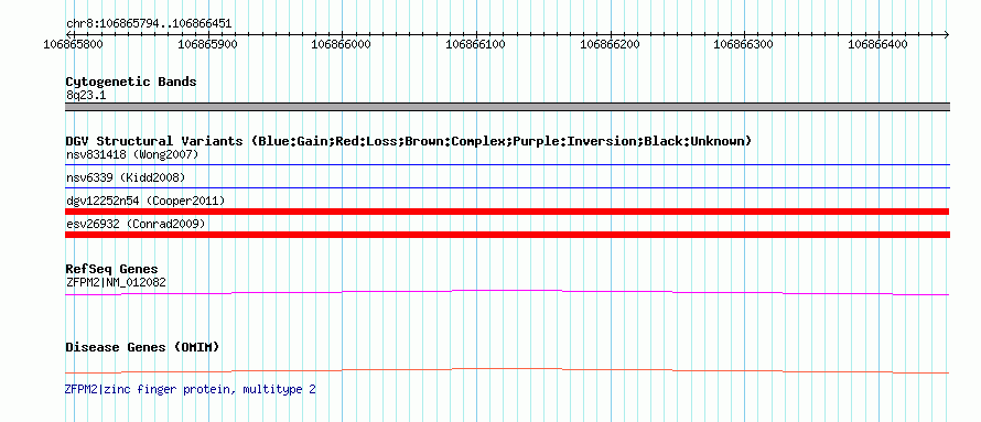 | | Variant Type | CNV loss | | Copy Number | | | Allele State | | | Allele Origin | | | Probe Count | | | Validation Flag | | | Merged Status | M | | Merged Variants | dgv12252n54 | | Supporting Variants | nssv1118233, nssv1118234 | | Samples | | | Known Genes | ZFPM2 | | Method | SNP array | | Analysis | Illumina SNP array copy number analysis | | Platform | Not reported | | Comments | | | Reference | Cooper_et_al_2011 | | Pubmed ID | 21841781 | | Accession Number(s) | nsv611839