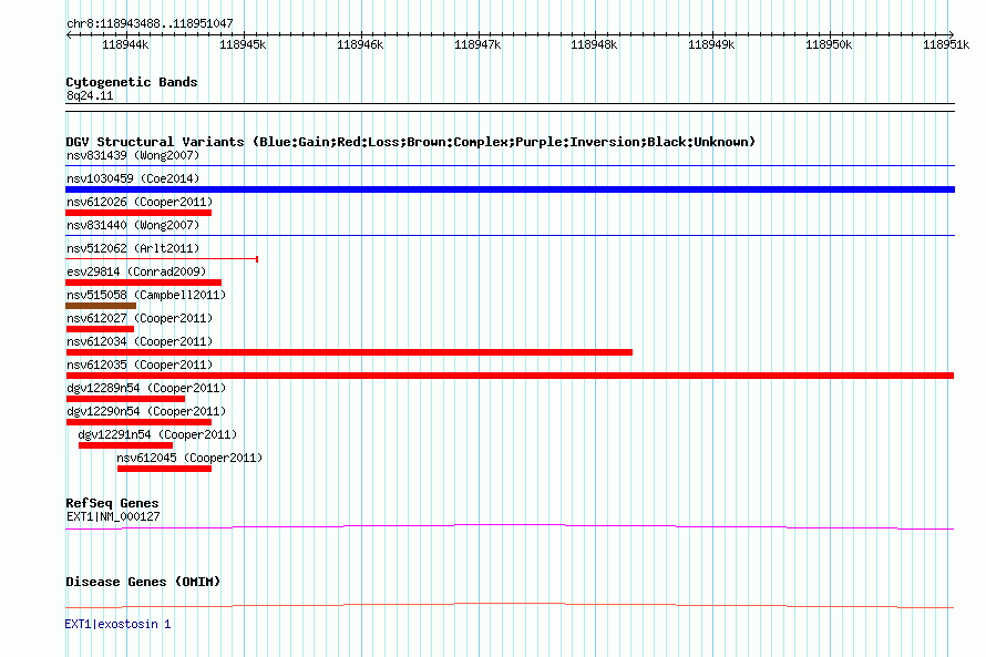 | | Variant Type | CNV loss | | Copy Number | | | Allele State | | | Allele Origin | | | Probe Count | | | Validation Flag | | | Merged Status | M | | Merged Variants | | | Supporting Variants | nssv1120102, nssv1120099, nssv1120087, nssv1120105, nssv1120100, nssv1120101, nssv1120088, nssv1120090, nssv1120103, nssv1120091, nssv1120098, nssv1120089, nssv1120094, nssv1120092, nssv1120096, nssv1120095, nssv1120097, nssv1120104, nssv1120093 | | Samples | | | Known Genes | EXT1 | | Method | SNP array | | Analysis | Illumina SNP array copy number analysis | | Platform | Not reported | | Comments | | | Reference | Cooper_et_al_2011 | | Pubmed ID | 21841781 | | Accession Number(s) | nsv612035