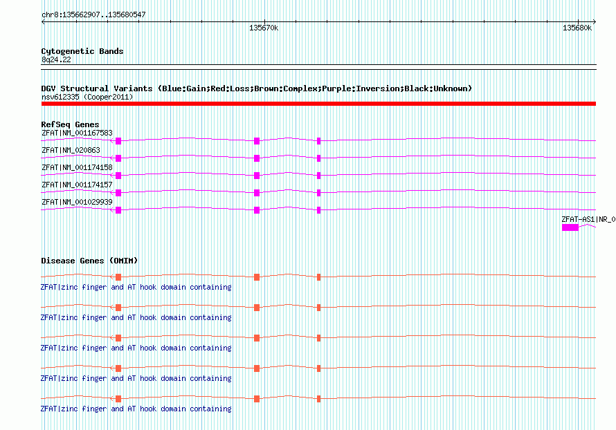 | Variant Type | CNV loss | Copy Number | | Allele State | | Allele Origin | | Probe Count | | Validation Flag | | Merged Status | M | Merged Variants | | Supporting Variants | nssv1156648 | Samples | HGDP00996 | Known Genes | ZFAT, ZFAT-AS1 | Method | SNP array | Analysis | Illumina SNP array copy number analysis | Platform | Not reported | Comments | | Reference | Cooper_et_al_2011 | Pubmed ID | 21841781 | Accession Number(s) | nsv612335